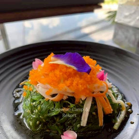 At Chiewlan Camp & Resort, dining is more than just a meal – it’s an experience that celebrates both nature and flavor. Each dish is beautifully presented with vibrant colors, edible flowers, and fresh ingredients that reflect the richness of Southern Thailand.